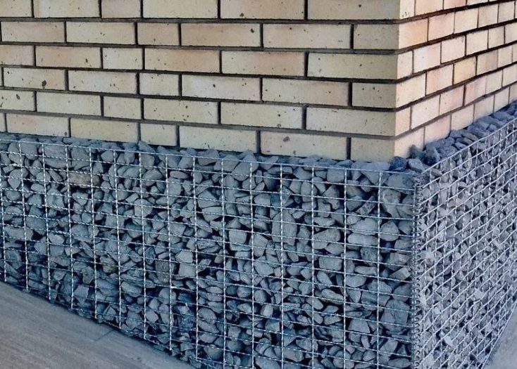 Этот элемент нечасто используется для фундаментов, но при этом смотрится оригинально и обходится не очень дорого. Конструкция представляет собой каркас из сетки, внутрь которого насыпается щебень или галька. Основные плюсы таковы: