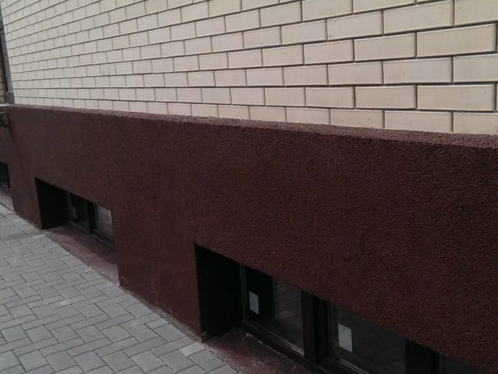 Подходит для поверхностей из бетона, конструкций из блоков и других готовых элементов. Работа может быть выполнена самостоятельно, но если нужно создать определенную структуру, лучше заранее попрактиковаться. Если вы не знаете, чем закрыть ленточный фундамент дома снаружи дешево и красиво, то это решение будет оптимальным, так как имеет много плюсов: