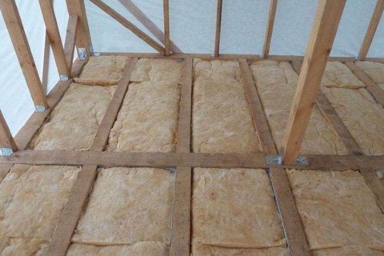 Лаги расставляются по ширине листа материала. По бокам можно сделать подрезку. Все щели по бокам каркаса закрываем монтажной пеной. Теперь укладываем утеплитель. Лучше всего – минеральная вата.