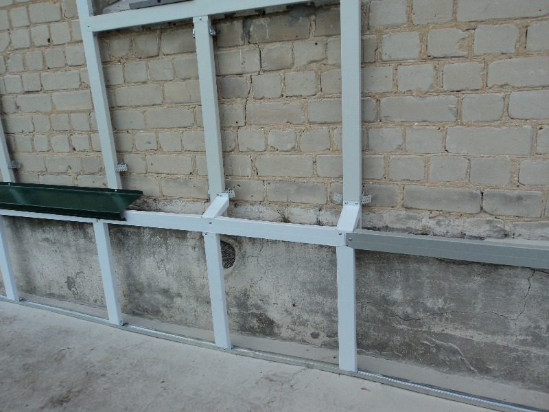 - Монтаж несущего профиля. Надежность цоколя из профлиста зависит от качества установки профиля. Он нарезается по размеру и закрепляется на кронштейнах саморезами по металлу со сверлом и пресшайбой 20-30 мм. Для получения более надежного соединения между двумя рядовыми профилями используется специальная планка.