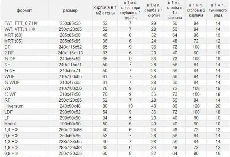 Эта таблица рассчитана для стандартного ГОСТ-овского кирпича, который можно купить в большинстве строительных магазинах. Но на производство распространяются и другие стандарты, диктующие собственные форматы. В этом случае будет правильнее воспользоваться этой таблицей.