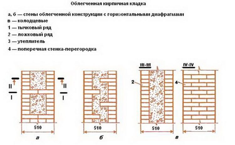 Эти виды кладки кирпича актуальны в малоэтажном строительстве. По сути это две стены, между которыми расположены пустоты. Они заполнятся теплоизоляционным материалов, вроде минеральных ват. Соединяются между собой они перевязками или арматурой.
