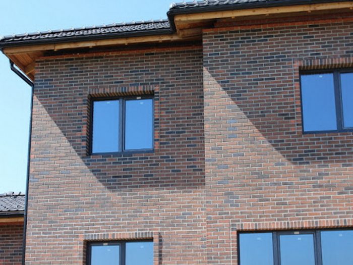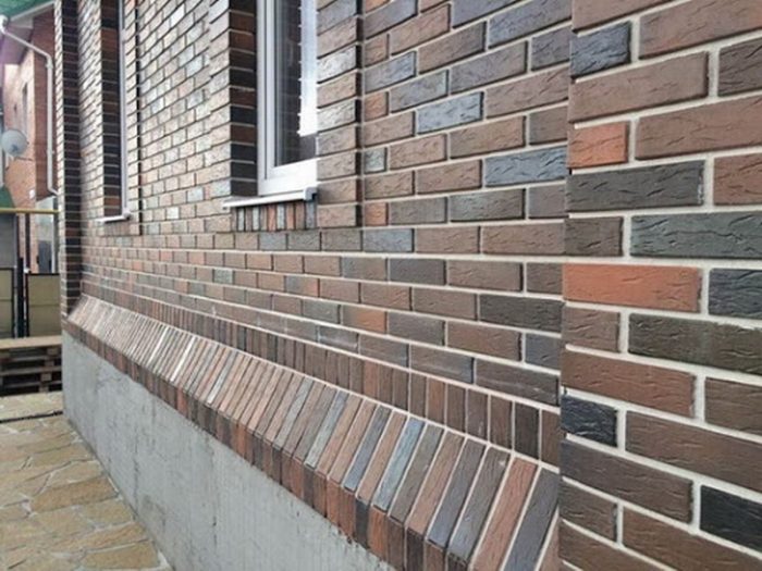 Часть фасадного ремонта с помощью декоративного кирпича. Лицевая кладка позволяет скрыть недостатки чернового камня без капитального ремонта.